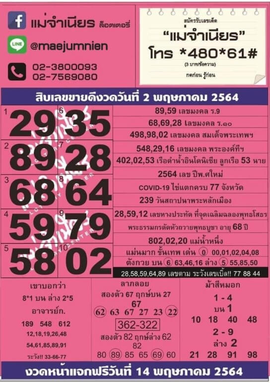 โดยทางเพจ Facebook ของร้านแม่จำเนียร จะมีการอัพเดตข้อมูลเลขเด็ด เลขดัง ในแต่ละงวดก่อนวันหวยออก 2 วัน ให้กับทุกคนที่สนใจได้รับทราบข้อมูลกัน